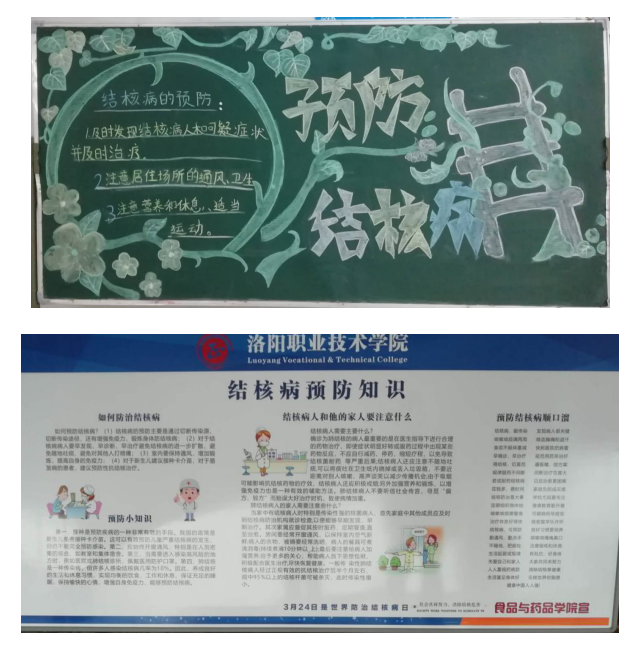食品药品学院分别在机场校区和红山校区摆放关于结核病防控的宣传展板资料和相应的黑板报,向学生宣感染结核病的症状、传播途径以及防治知识。