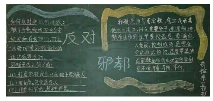 为了建设和谐校园,维护社会稳定,在学生处、保卫处的领导下,食品与药品学院在各班进行了反邪教主题的系列教育活动。此次主题系列活动主要包括“反邪教相关知识主题教育”,以及反邪教主题的黑板报宣传。