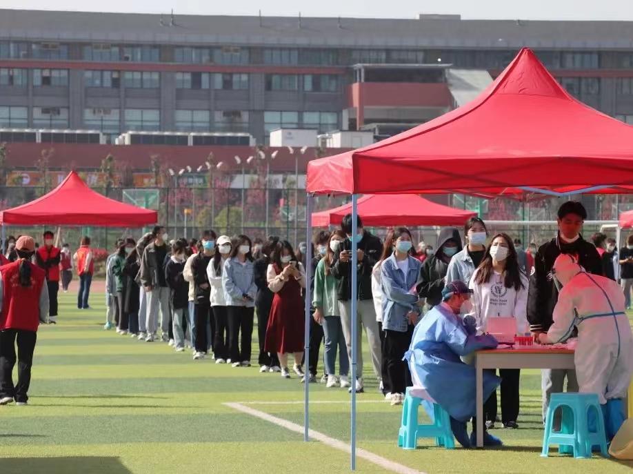 本次核酸检测地点设在操场,各班级按要求到指定地点排队,通过志愿者的引领分组入场,保证了采样的快捷高效,节省了医护人员的宝贵时间,将疫情在校园传播的风险降到了最低。