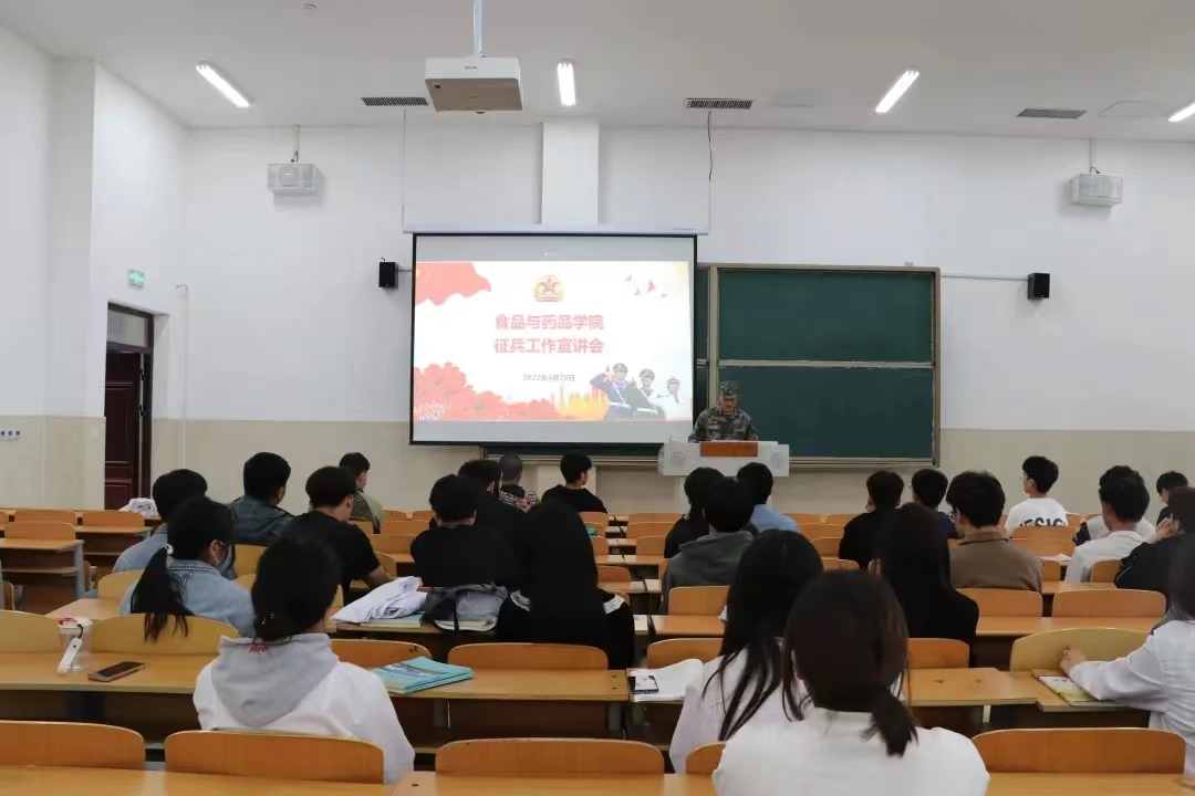 为深入贯彻落实习近平强军思想,激发学院学子的参军爱国热情,食品与药品学院于4月29日在三号实训楼开展2022年征兵政策宣讲会。