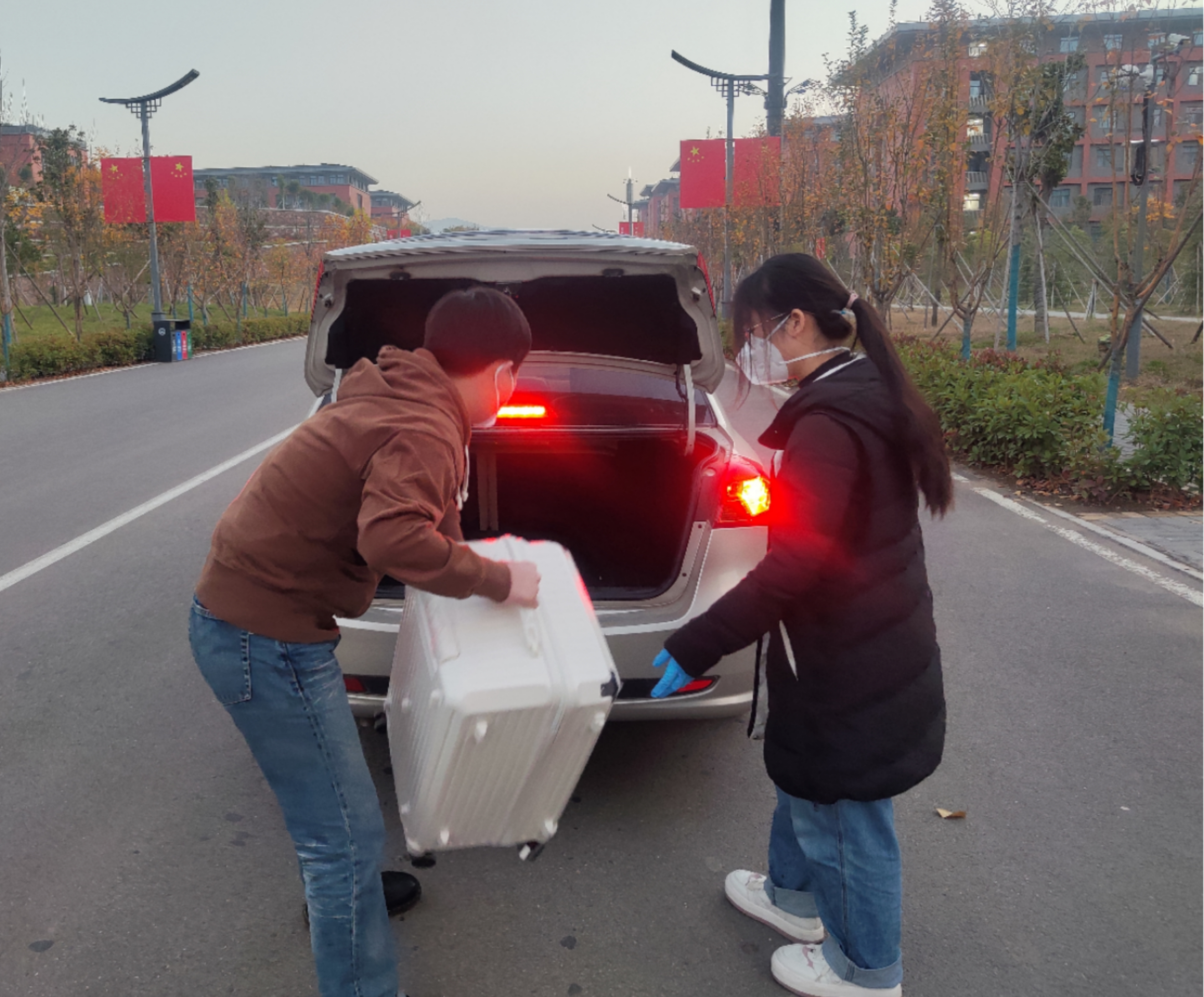 “老师,偃师区静默了,家人没法来接我,我没办法回家了”。得知部分学生面临的实际困难后,辅导员老师及时与学生家长及所在的社区进行联系,在遵守各地疫情防控政策的同时,帮助学生顺利返乡。此外,毛福超、茹鹏辉等多名老师自发组建一支“爱心车队”,主动将学生安全送至家中,以实际行动温暖了学生的回家路。