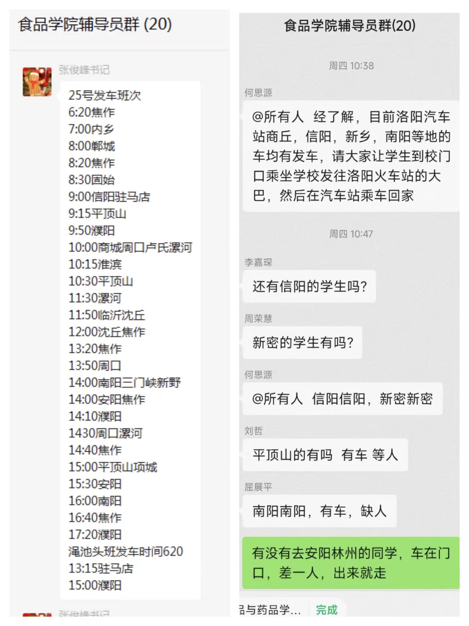 在学生返乡期间,书记及全体辅导员老师坚持24小时在岗,多轮次详细搜集掌握学生返乡意愿、行程安排,准确掌握每位学生的离校时间。针对买不到车票无法返乡的同学,老师们积极与交通运输部门联系,协助学生购买车票,保障学生顺利、安全返乡。
