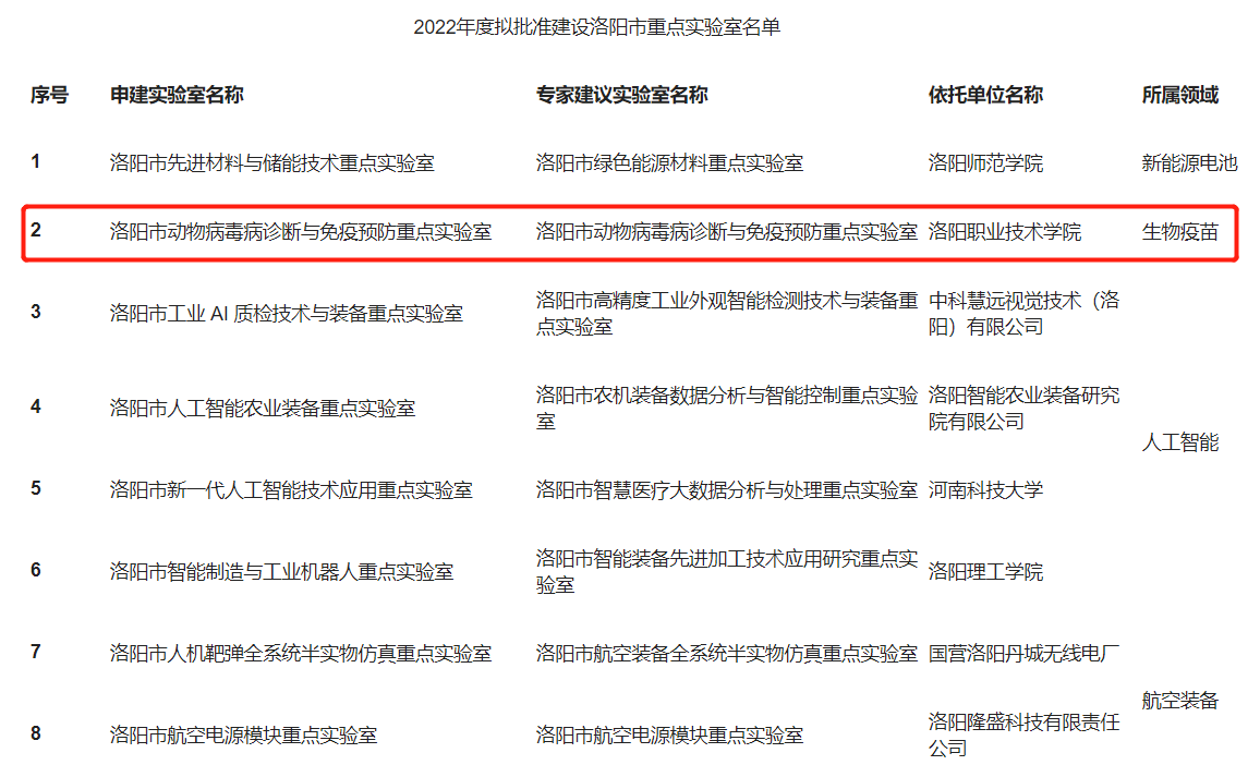 近日,洛阳市科学技术局发布关于《2022年度拟批准建设洛阳市重点实验室名单的公示》,我院申报的“洛阳市动物病毒病诊断与免疫预防重点实验室”获批立项建设,该实验室为我校首个市重点实验室。