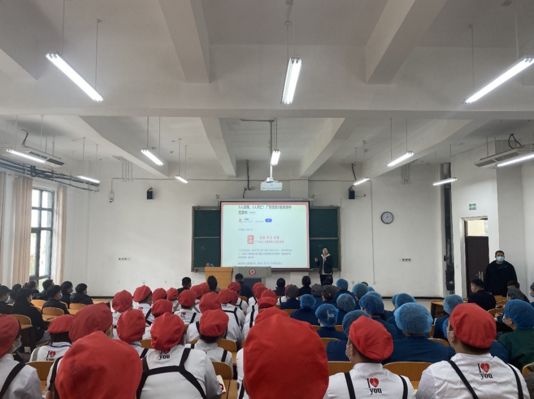 3月17日,食品与药品学院联合校后勤保卫处对食堂从业人员进行食品安全卫生知识培训。本次培训会由后勤保卫处副处长秦新武主持,食品专业教师屈展平主讲,校膳食中心及餐饮公司负责人、从业人员共90余人参与培训。