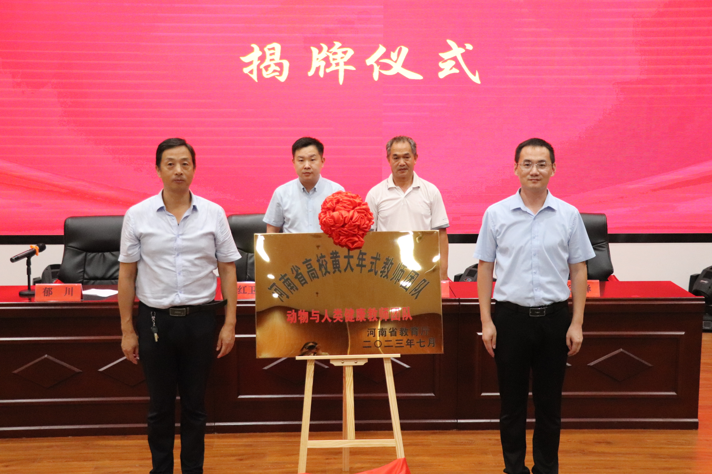 郁川宣读了河南省教育厅第三批高等职业学校“河南省高校黄大年式教师团队”评审结果及教师团队情况,并由李红卫、张贺伟为“动物与人类健康教师团队”授牌。
