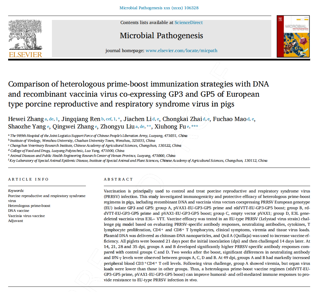 张贺伟博士在《Microbial Pathogenesis》发表SCI文章,题名为Comparison of h-eterologous prime-boost immunization strategies with DNA and recombinant vaccinia virus co-expressing GP3 and GP5 of European type porcine reproductive and respiratory syndrome virus in pigs。该杂志影响因子IF=3.8,中科院分区3区。中国人民解放军联勤保障部队第989医院、温州大学病毒研究所、中国农业科学院长春兽医研究所及中国农业科学院特种动物疫病重点实验室为合作单位。疫苗接种及合理的免疫程序是预防和控制猪繁殖和呼吸综合征病毒(PRRSV)感染主要有效策略。欧洲型PRRSV近几年传入我国,致病性也逐渐增强,目前我国并无商业化的疫苗可用。该研究在构建欧洲型PRRSV疫苗的基础上,比较了不同prime-boost免疫方案的保护效果,结果表明:重组疫苗rddVTT-EU-GP3-GP5初免和DNA疫苗pVAX1-EU-GP3-GP5加强免疫策略可以有效改善体液和细胞介导的免疫反应,从而提高疫苗的保护效率。