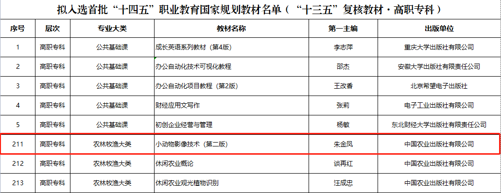 朱金凤教授主编的《小动物影像技术(第二版)》(“十三五”复核教材)入选首批“十四五”职业教育国家规划教材。