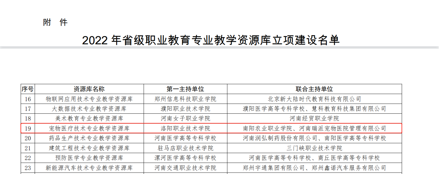 近日,河南省教育厅发布了2022年河南省职业教育专业教学资源库立项名单。食品与药品学院主持申报的“宠物医疗技术专业教学资源库”获批省级教学资源库立项。