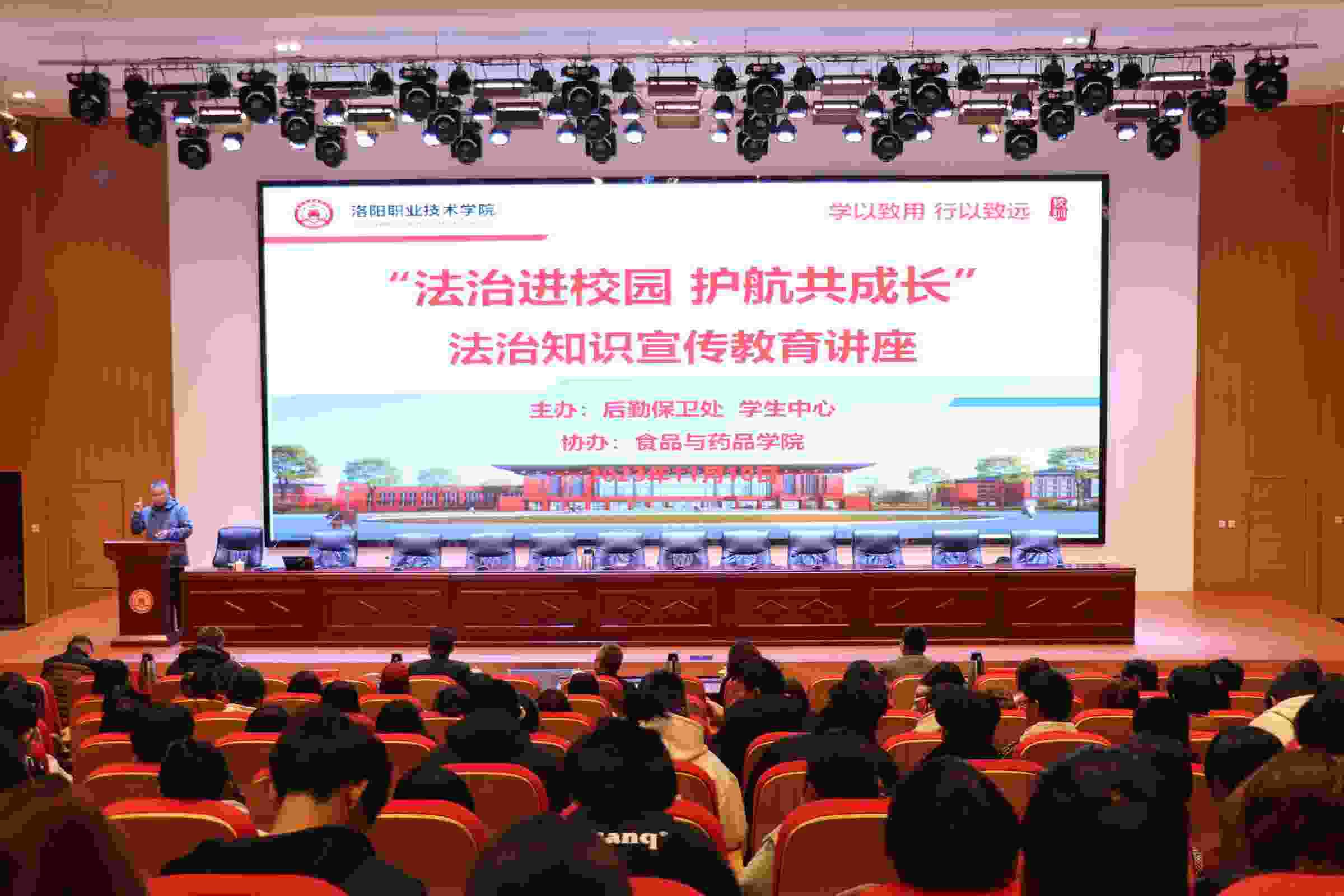 为提升学生法治素养,教育引导学生远离校园违法行为,11月10日,由我校学生中心、后勤保卫处联合主办,食品与药品学院承办的“法治进校园,护航共成长”法治教育专题讲座在大学生活动中心一楼报告厅成功举办。本次讲座特邀北京盈科(洛阳)律师事务所股权高级合伙人闫宁、河南都典律师事务所执行主任苗武涛为主讲嘉宾,我校300余名师生代表参加此次讲座。