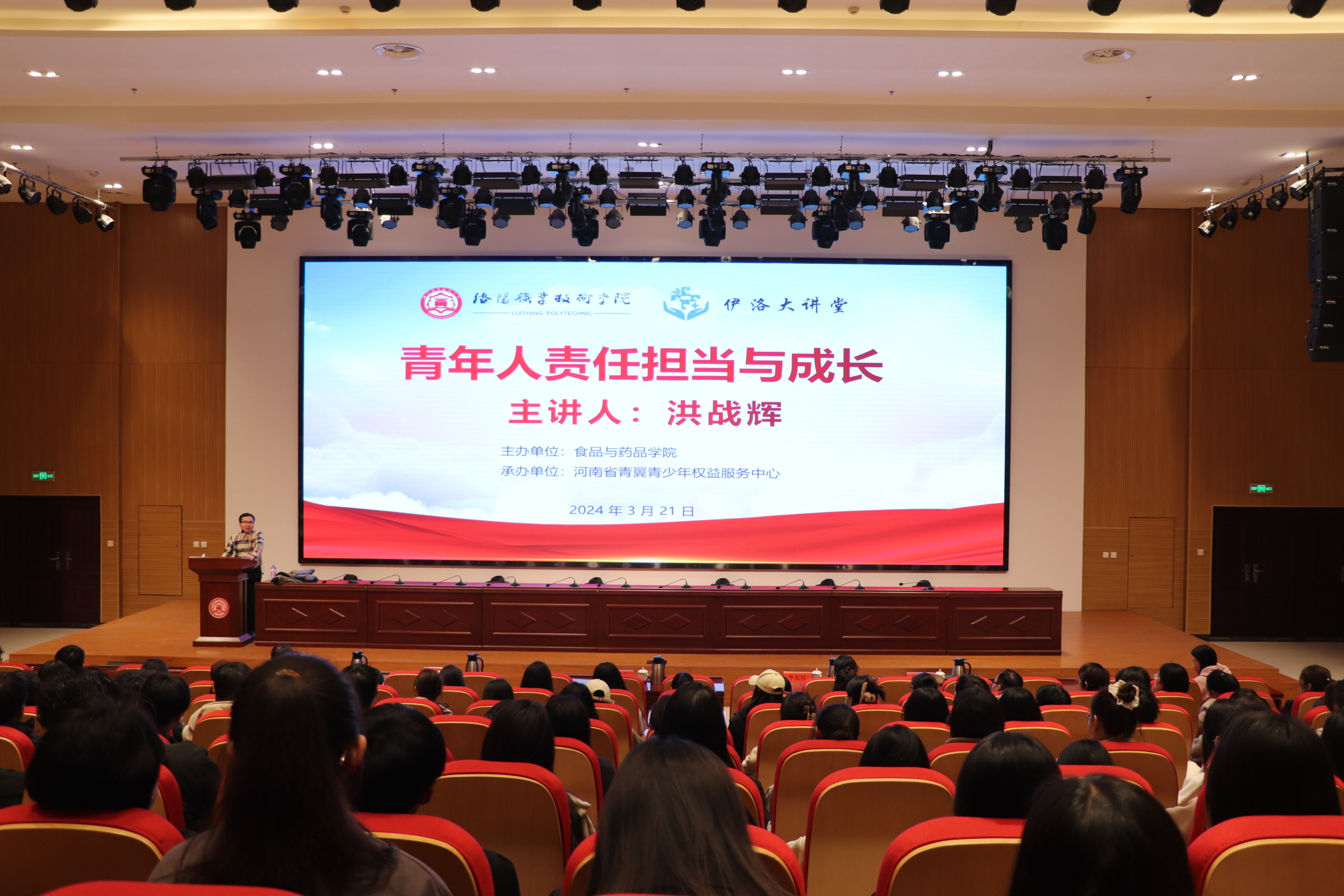 3月21日晚上,由食品与药品学院主办,河南省青翼青少年权益服务中心承办的伊洛大讲堂第二期在大学生活动中心一楼报告厅举行,“感动中国”2005年度人物,第十七届中国十大杰出青年洪战辉应邀开讲。校长李保安、纪委书记李东红出席讲座,食品与药品学院党政领导班子及三百余名师生现场聆听讲座。