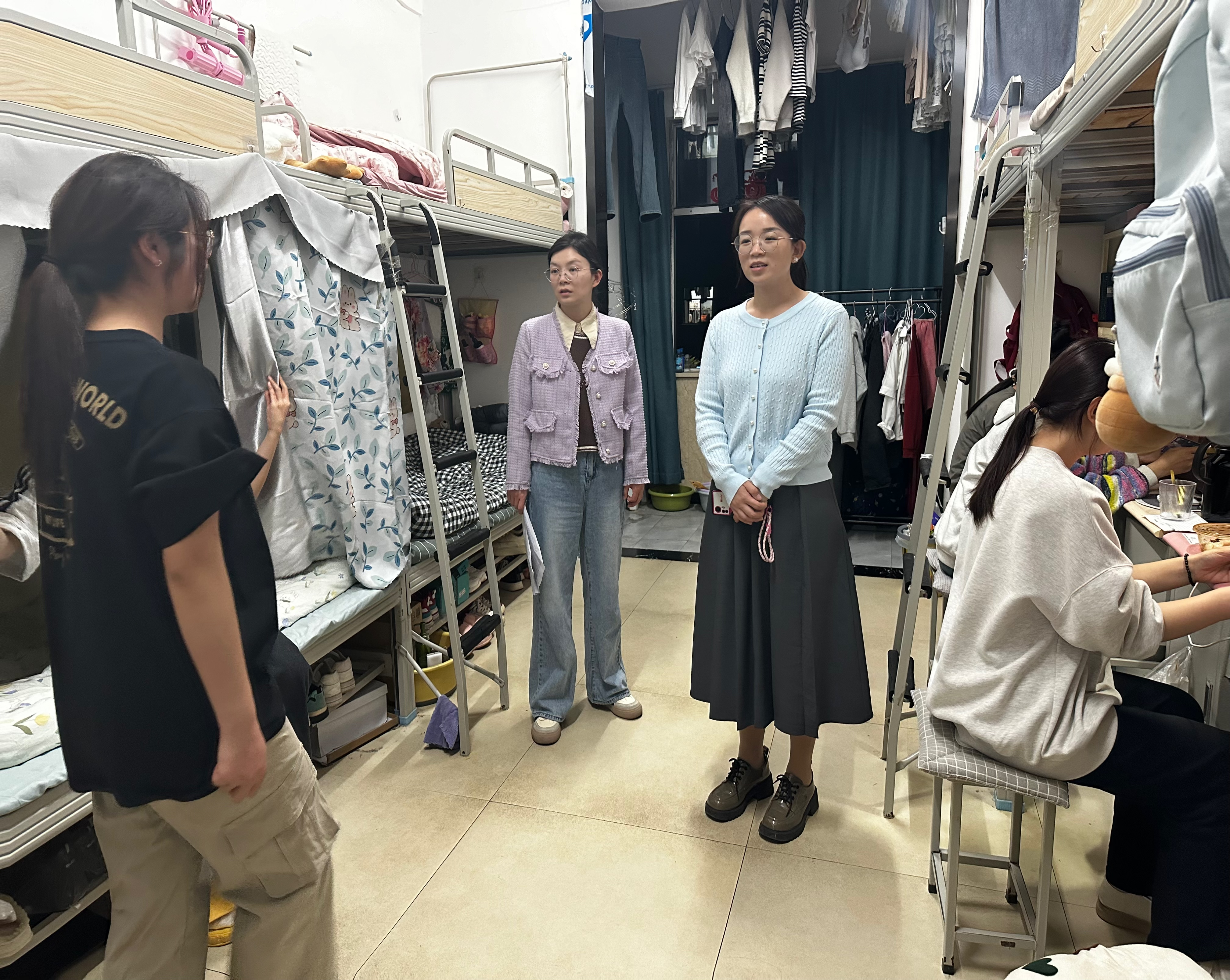 检查过程中,学院检查小组成员深入学生宿舍,重点检查违规使用大功率电器、私拉乱接电线、堆放易燃易爆物品等安全隐患,并认真记录学生请假、晚归等情况。在宿舍里,老师们与学生细心交谈,了解学生的思想状况、学习生活状况,提醒同学们要增强安全防范意识,遵守宿舍管理规定,每日按时归寝,养成良好的卫生习惯,共同营造干净、舒适的宿舍环境。