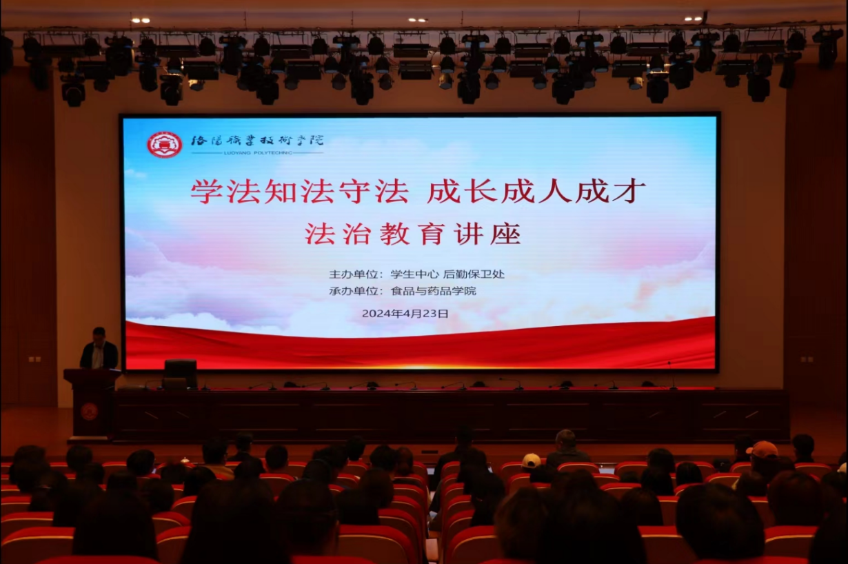 为深入学习贯彻习近平法治思想,认真落实教育系统“八五”普法规划,加强青年学生法治教育,4月23日上午,由我校学生中心、后勤保卫处联合主办,食品与药品学院承办的“学法知法守法,成长成人成才”法治知识宣传教育讲座在大学生活动中心一楼报告厅成功举办。本次讲座特邀洛阳市公安局伊滨分局李村派出所三级警长齐鹏飞,洛阳市高新区人民法院综合审判庭庭长王凯、法官助理王晓雯为主讲嘉宾,我校300余名师生代表参加此次讲座。