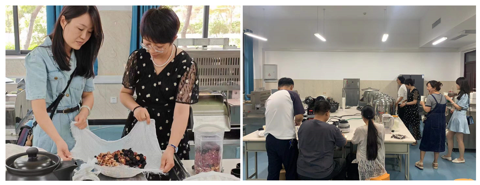 教研室老师们早早地开始准备酸梅汤的熬制工作。从选材、称量到熬制,每一步都严格按照传统工艺进行,确保酸梅汤的口感和药效。经过数小时的精心熬制,一桶桶香气扑鼻、酸甜可口的酸梅汤终于完成。