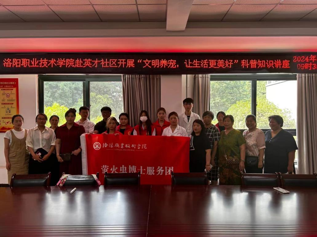 为发挥职业院校服务地方、服务群众的职能,充分展示学院改革发展成就和教书育人成果,普及文明养宠、科学养宠知识,提升学院师生的实践动手能力,7月2日,食品与药品学院“萤火虫博士服务团”联合洛职爱宠联盟社团、洛阳关爱动物医院在英才社区开展“文明养宠,让生活更美好”科普知识讲座活动。