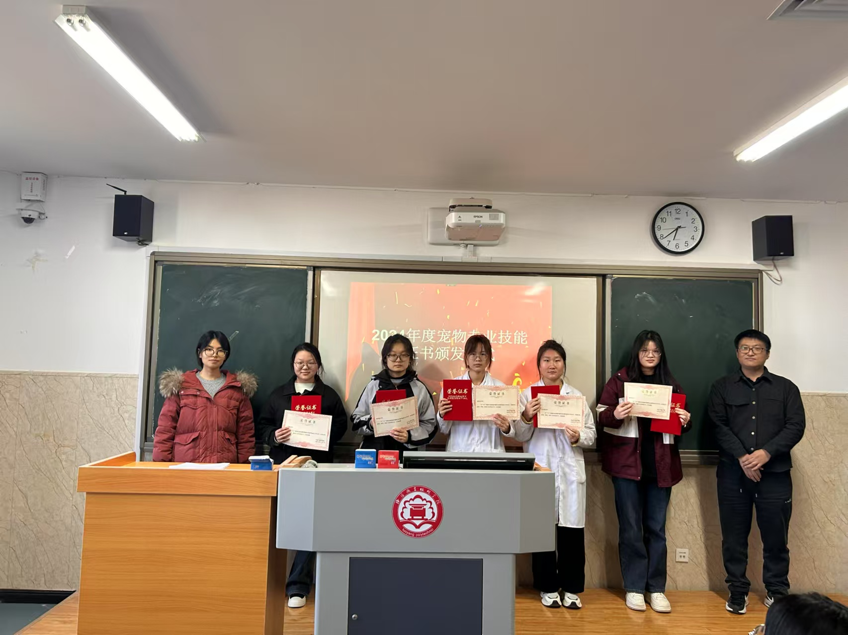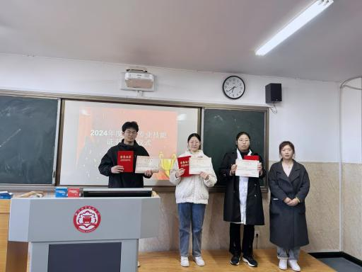 11月29日中午,食品与药品学院在7号实训楼310教室举行了宠物职业技能证书颁奖仪式。本次颁奖仪式旨在对成功通过执业兽医资格证考试、“1+X”宠物护理与美容以及 “1+X”家庭农场畜禽养殖职业技能等级证书考试的同学予以表彰。食品与药品学院宠物医疗技术教研室主任翟崇凯、宠物养护与驯导教研室主任毛福超、学工办主任张凯奇、团支部书记魏笑及教学动物医院院长王聪慧出席颁奖仪式并为获奖学生颁奖。