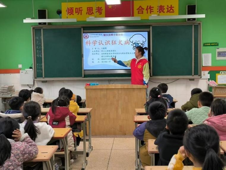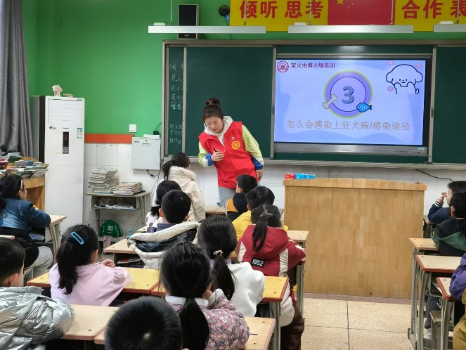 活动中,服务团成员教师王聪慧通过生动有趣的讲解,配合图文并茂的PPT,向学生们介绍了狂犬病的危害、感染途径以及如何避免被宠物咬伤抓伤的防护知识。为了让孩子们更好地理解狂犬病预防的重要性,老师们还特别设计了互动环节,鼓励大家提出问题并现场进行解答,形成了良好的教学互动氛围。