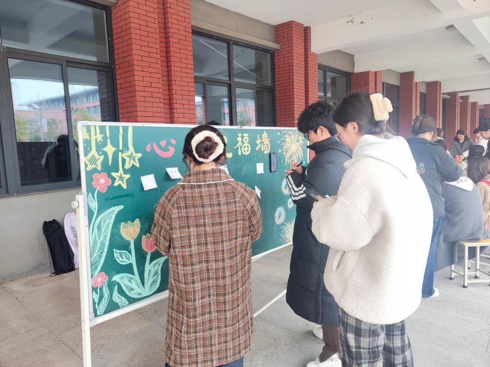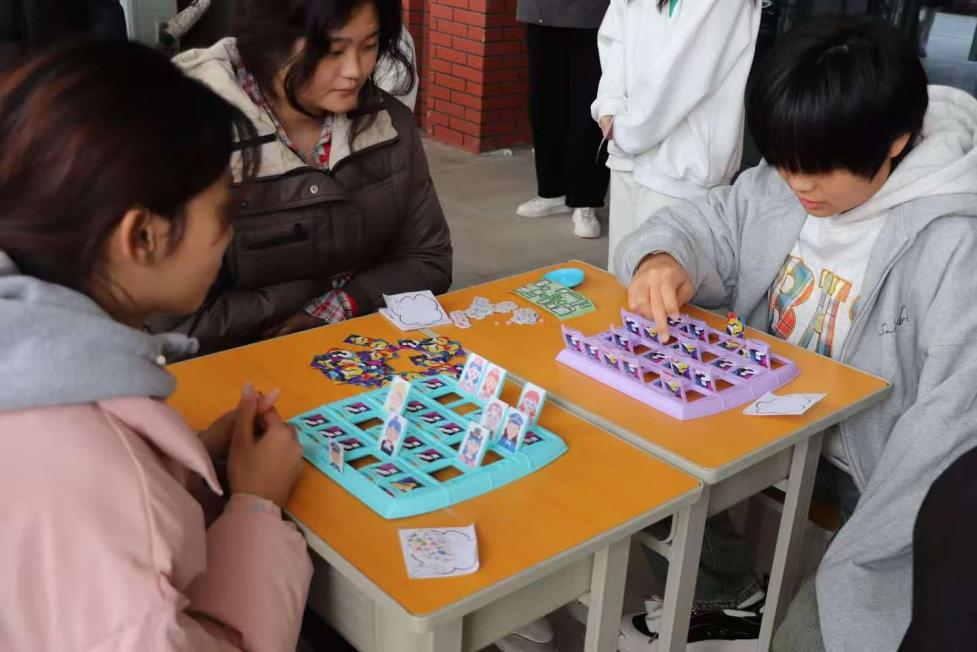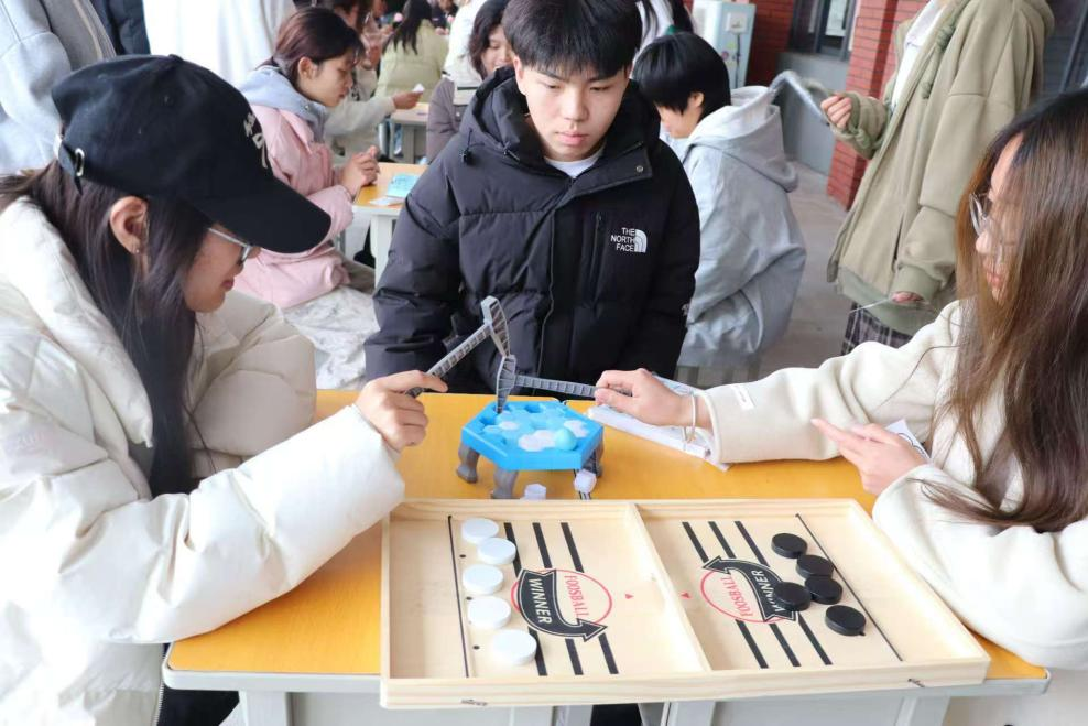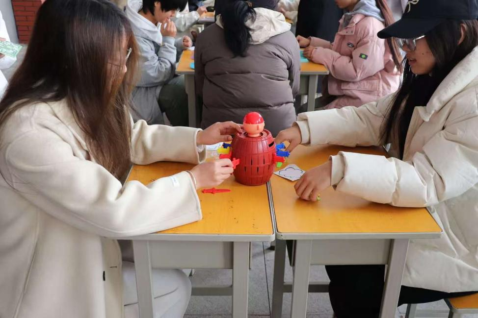 不远处的 “绘写心灵祝福” 功能区同样人气高涨。长长的展示板上挂满了五颜六色的便签纸与卡片,师生们纷纷拿起笔,在纸上写下对自己、对他人的美好祝福与鼓励话语。在“企鹅敲冰”“海盗桶”等趣味游戏中,参与者们专注的神情与独特动作,引得观大家欢笑不断,紧张与压力也随之消散。