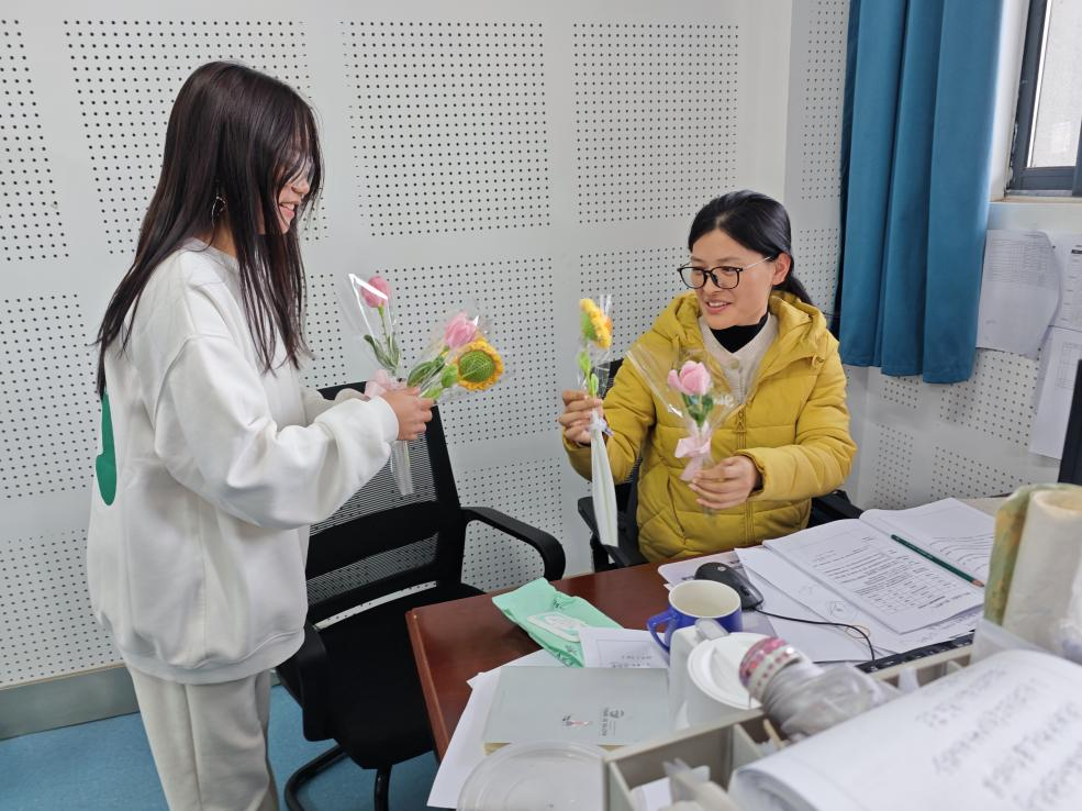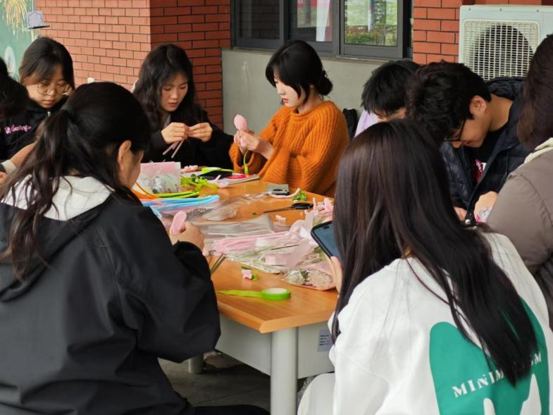 活动现场设置了“手作花间,慰人心田”“绘写心灵祝福”和趣味游戏三个功能区,吸引了众多学生踊跃参与,校园内营造出浓厚的关注心理健康氛围。心理辅导站精心准备了丰富的花艺 DIY 材料包,各式各样的花材、色彩斑斓的包装纸以及精致的装饰品摆满桌面。同学们充分发挥创意,根据个人喜好自由搭配花材,亲手制作并包装出独一无二的花束。