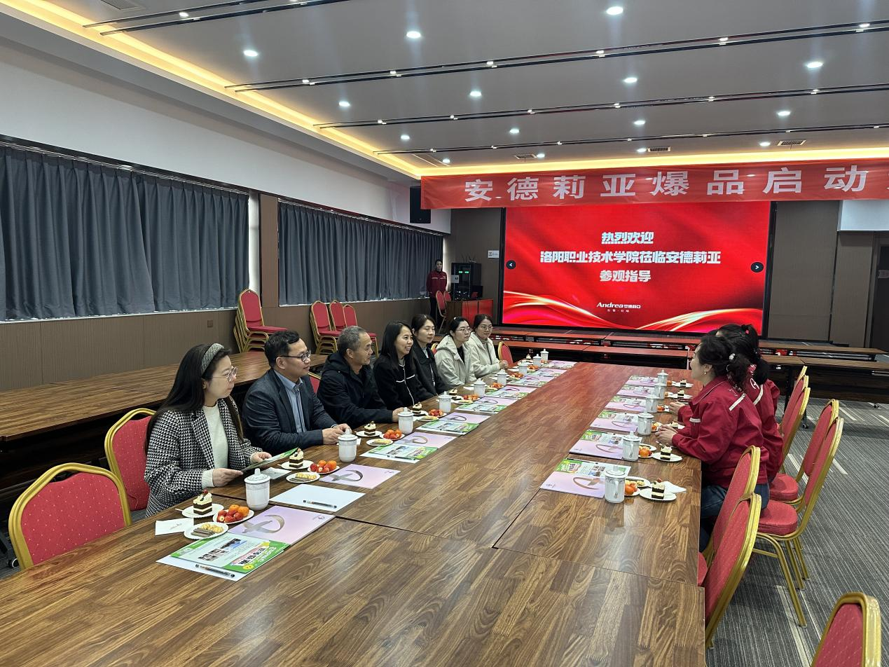 结束卡萨米亚的交流后,团队即刻前往洛阳安德莉亚。在公司副总经理阮朝霞的引导下,教师们参观了厂区及生产车间,深入了解企业规模与生产运营模式。阮朝霞详细介绍了公司当下的发展现状以及过往学生实习就业情况,让学院教师对企业有了更全面的认识。随后,双方围绕实习招聘宣讲与未来合作方向展开沟通交流,就进一步深化校企合作、优化实习培养机制、促进产学研融合等达成诸多共识。
