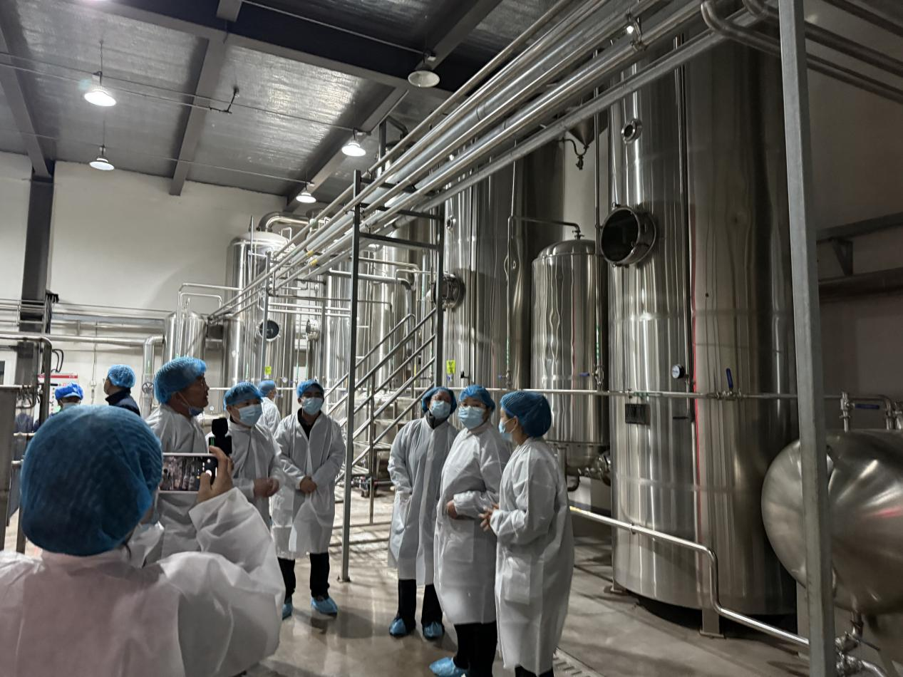 在洛阳惠德生物技术总监栗子丰的带领下,师生们首先参观了公司新版GMP认证的智能化生产车间。车间内,粉剂、预混剂、颗粒剂等11种剂型的生产线高效运转,全自动化设备与人工质检环节紧密结合,展现了兽药生产的严谨性与科技化水平。技术团队现场演示了固体制剂压片、无菌灌装等核心工序,并讲解物料管理、设备维护等操作规范。