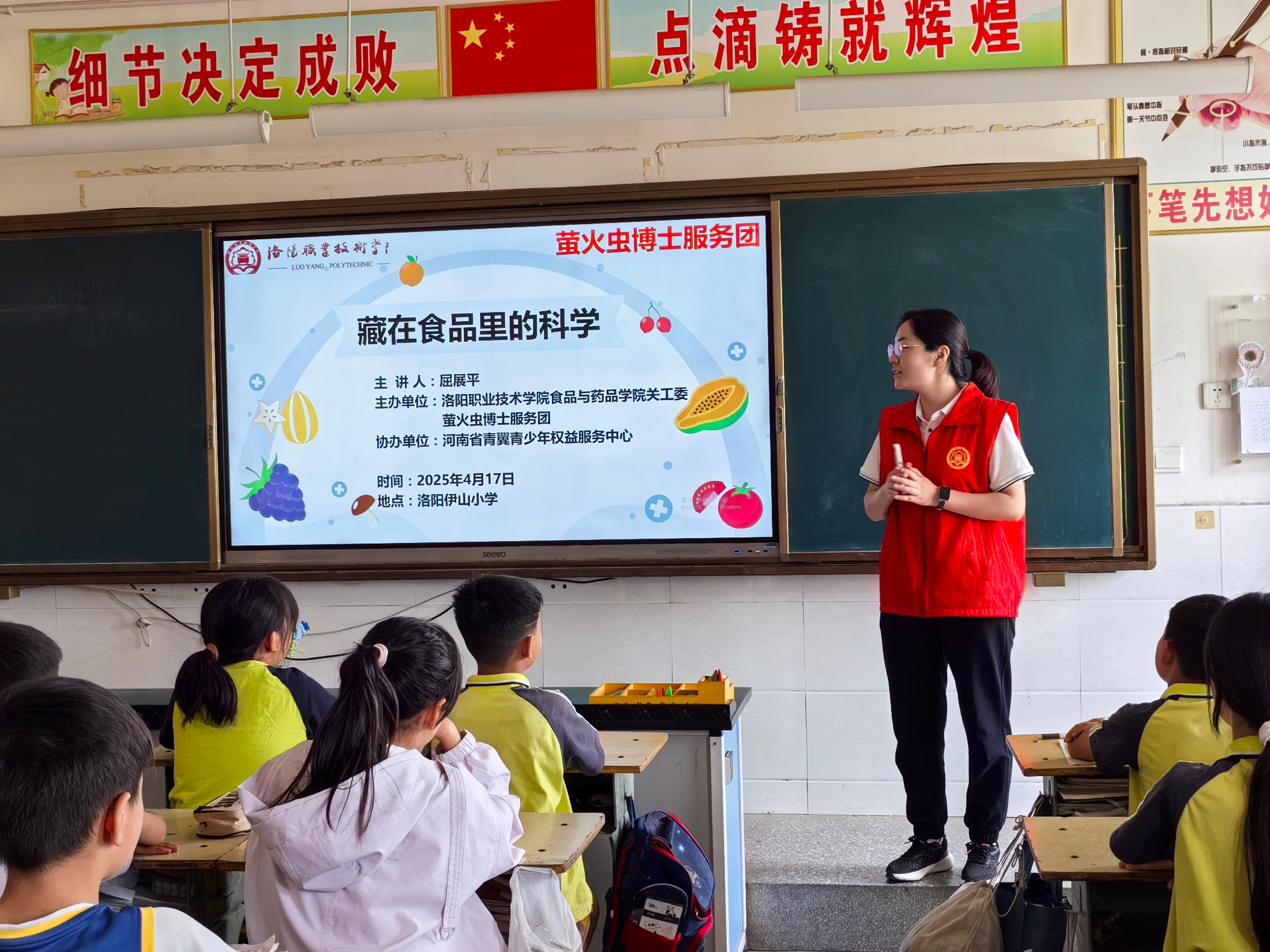 4月17日,在河南省青翼青少年权益服务中心、洛阳市伊滨区妇联及洛阳职业技术学院食品与药品学院关工委的支持下,萤火虫博士服务团走进洛阳伊山小学,以生活食材开展趣味食品科学实验,为四年级学生带来“藏在食品里的科学”科普宣讲,助力激发科学探索兴趣。