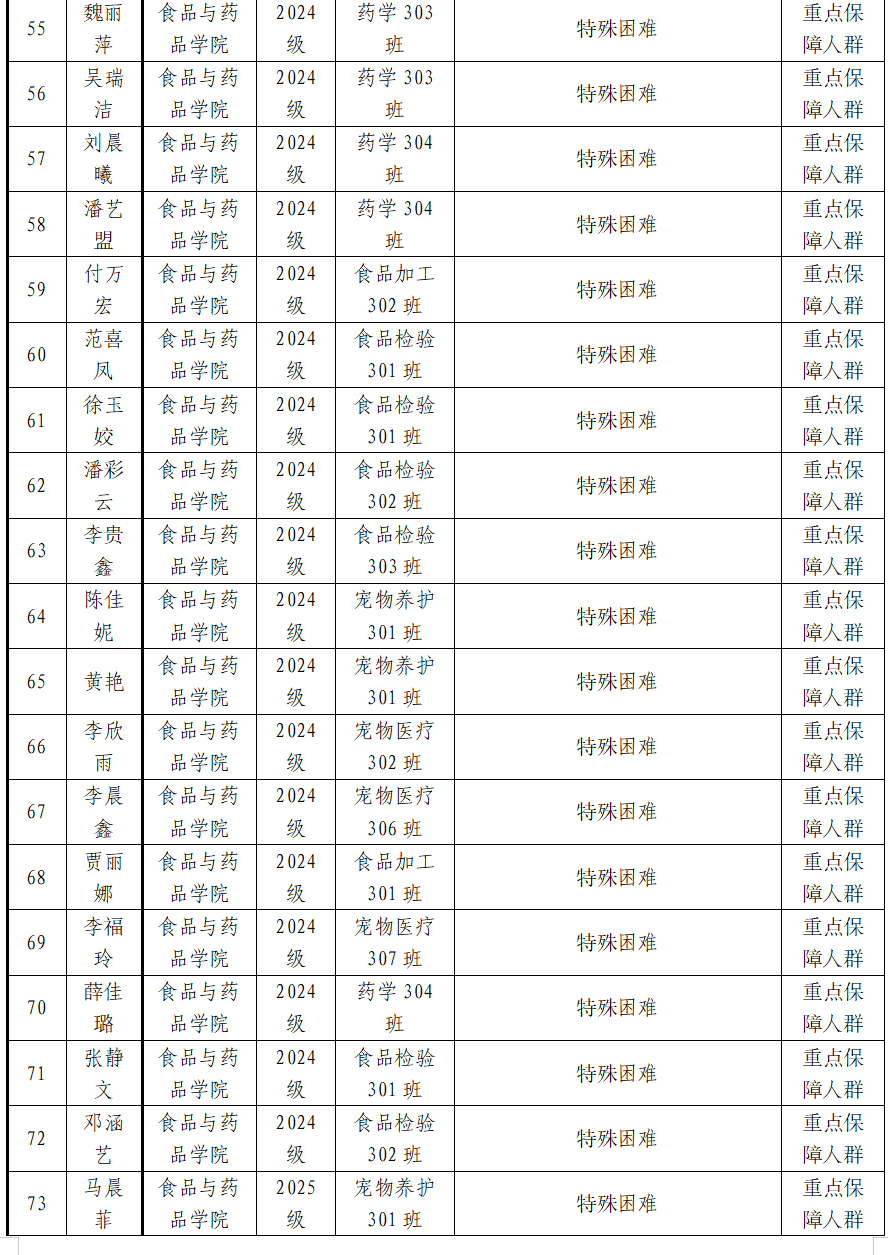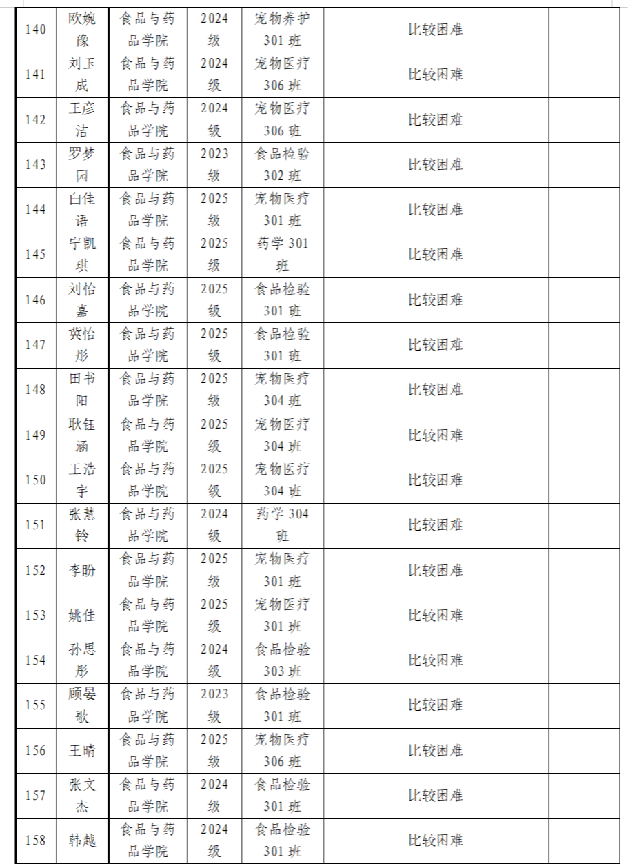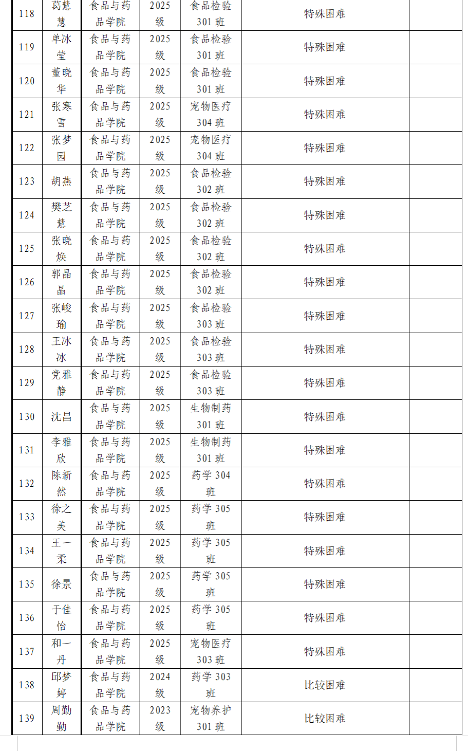 食品与药品学院|2025—2026 学年本专科家庭经济困难学生认定名单公示