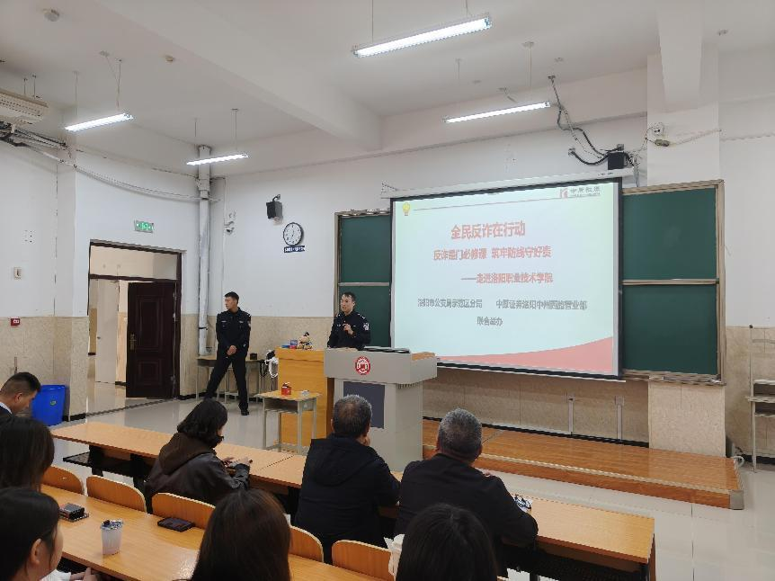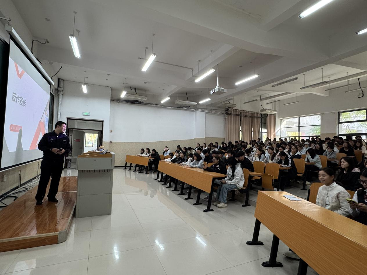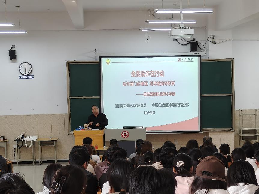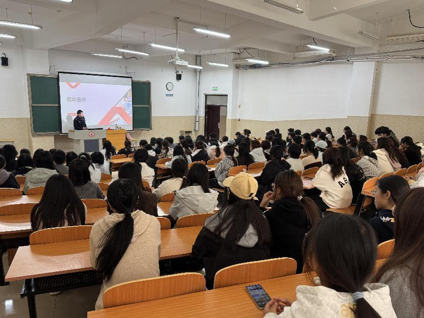 2025年10月28日下午,为增强新生防范电信网络诈骗意识,食品与药品学院联合伊滨公安分局民警及中原银行证券工作人员,在五号教学楼为2025级新生举办了一场内容丰富、案例生动的反诈宣传教育活动。
