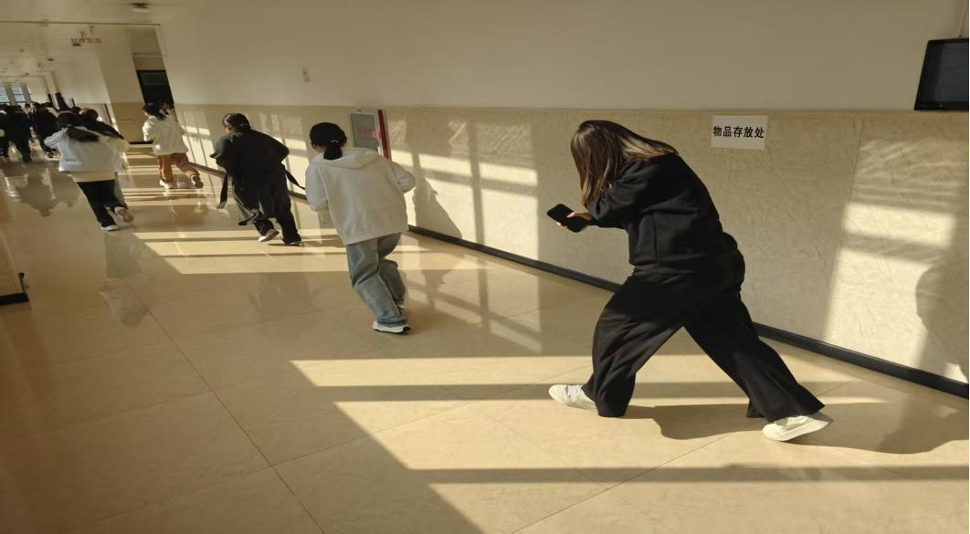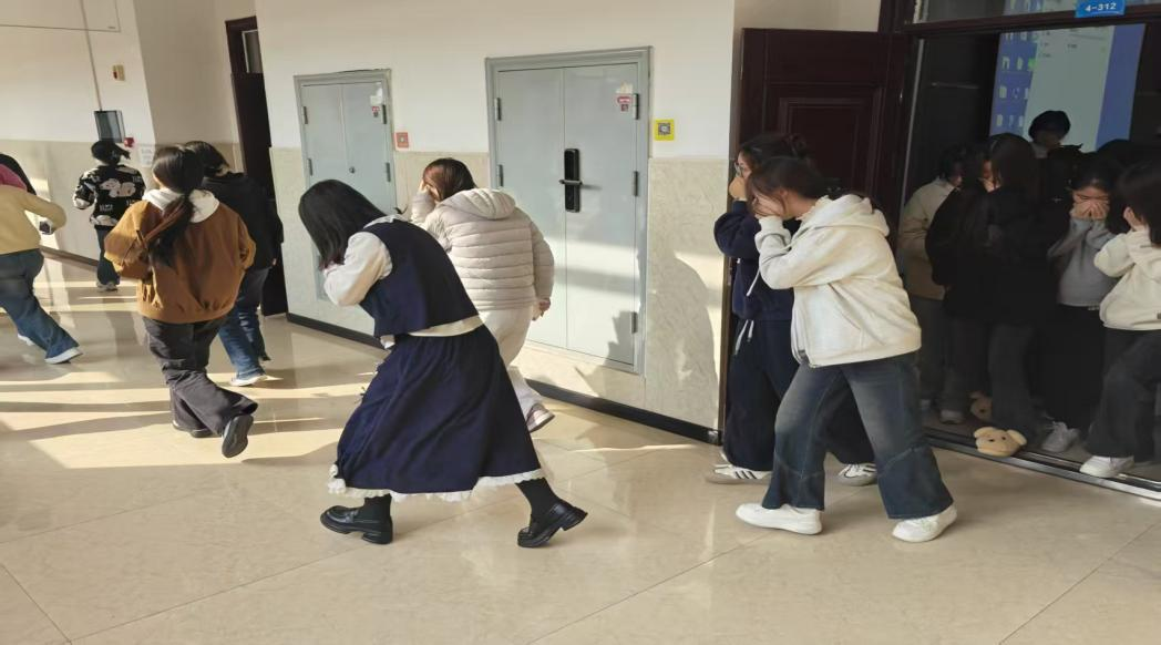随着警报声响起,演练进入实战阶段。4号楼内的学生在老师的指引下,迅速作出反应。 学生们按照预先规定的疏散路线,用湿毛巾捂住口鼻,低姿快速向安全区域移动。整个疏散过程井然有序,未出现拥挤、踩踏等情况。不到五分钟,全体学生已全部到达指定安全区域。 应急疏散演练环节检验了学院应急预案的可行性,也展现了学生面对突发事件的镇定态度和训练有素的应对能力。