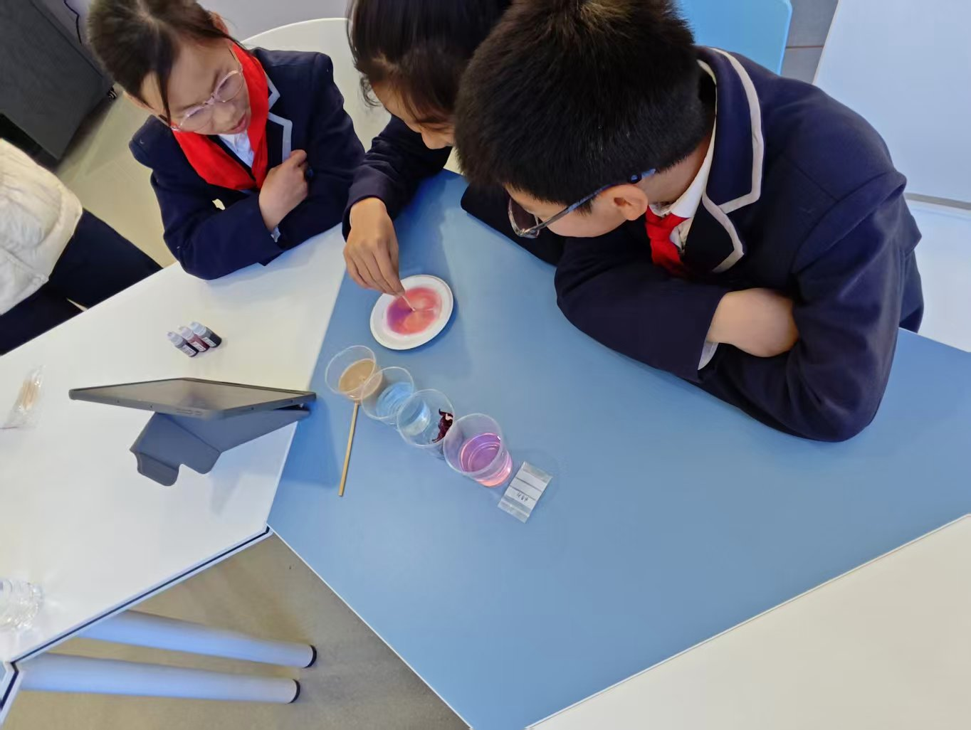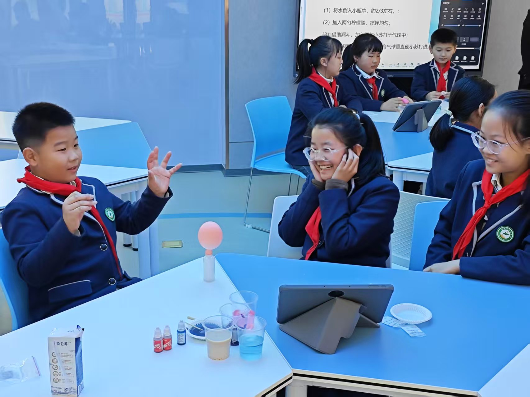 活动现场,博士团成员用通俗化表达与可视化演示拆解专业知识,让抽象的食品科学原理变得可感可触。“紫甘蓝变色”实验中,紫甘蓝汁遇不同溶液瞬间切换红、蓝、绿等色彩,让孩子们初次认识到食品成分间的化学反应;在牛奶可乐实验环节,牛奶倒入可乐后,迅速产生沉淀并翻滚,这一现象直观展现了蛋白质遇酸变性的原理。“烟花牛奶”实验将活动氛围推向顶峰,白色牛奶中滴入彩色食用色素后,一滴洗洁精便能触发“微观烟花秀”,斑斓色彩在液面扩散蔓延,孩子们的欢呼声此起彼伏。博士团成员结合实验现象,用生活化比喻讲解实验原理,让孩子们也能初步理解科学的奥秘。在“瓶子吹气球”实验环节,小苏打与柠檬酸的酸碱反应让气球逐渐膨胀,孩子们亲手见证科学奇迹,脸上洋溢着满满的成就感,简单的欢呼中饱含对科学的热爱与探索欲。