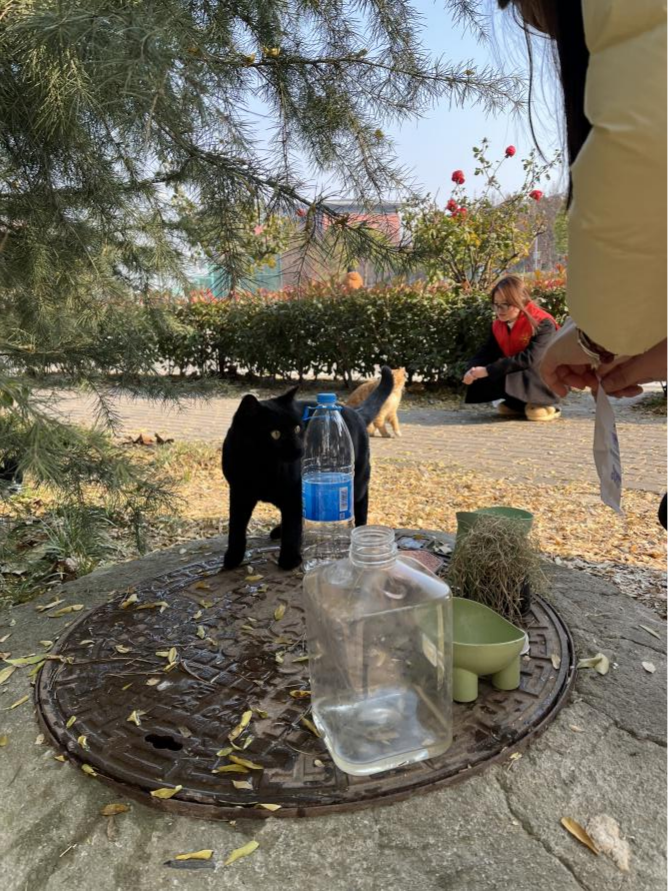 活动期间,志愿者团队重点开展三大核心工作。在生活环境优化方面,大家分工协作,对校园流浪动物生活区进行全面清扫,清除垃圾、落叶及排泄物,减少细菌滋生。之后,志愿者们逐一清洗猫粮碗、水碗并进行消毒处理,更换潮湿发霉的垫材,从饮食、居住两方面为流浪动物提供良好的生存保障。