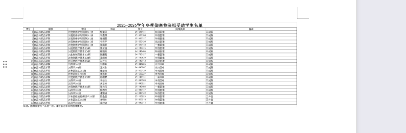 根据洛阳职业技术学院学生中心《关于做好2025-2026学年冬季困难学生御寒物资发放工作的通知》《2025-2026学年冬季困难学生御寒物资分配表》要求,经学生个人申请,班级评议小组评议、学院学生资助工作组审议。2025年我院共推评拟受助学生23人,其中20人拟获得羽绒服物品资助,3人拟获得五件套(帽子、围巾、手套、保暖卫衣、保温杯)资助。为保证评选工作公开、公正、公平,现将拟受助学生名单予以公示(名单附后),详细信息张贴于7-216外公示栏及学院官网。