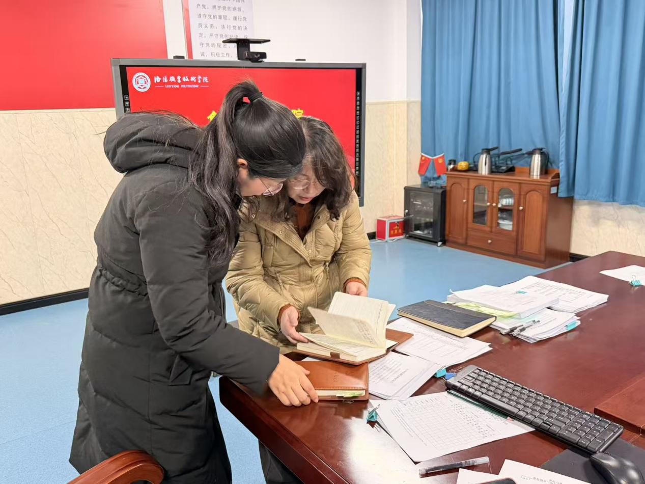随后,考核组细致查阅了学院党建工作台账、会议记录、学习资料、党风廉政建设相关文档等材料,并通过现场问询等方式,对学院党建规范化建设、领导班子履职、干部队伍管理等情况进行了深入了解。考核组对学院在党建业务融合、材料归档规范等方面的工作成效给予了肯定,并就部分细节提出了改进建议。